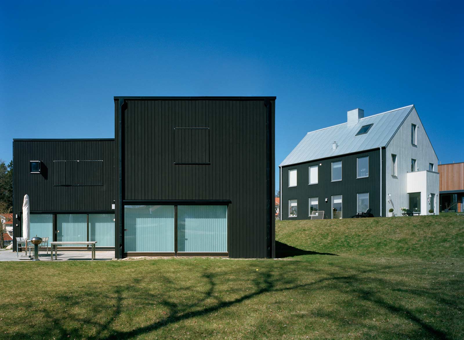 Centrum i det här huset ligger lite lustigt nog utomhus. Från den slutna nedtonade entrésidan möts man inomhus av det ljus som de stora fönsterpartierna släpper in i kök och vardagsrum. Och väl i vardagsrummet blickar man inte bara ut mot den stora skyddade uteplatsen utan även vidare och in i köket som ligger i husets andra vinkel. Detta ger både öppenhet och avskildhet och skapar spännande perspektiv – man blir liksom en åskådare in i sitt eget hus.